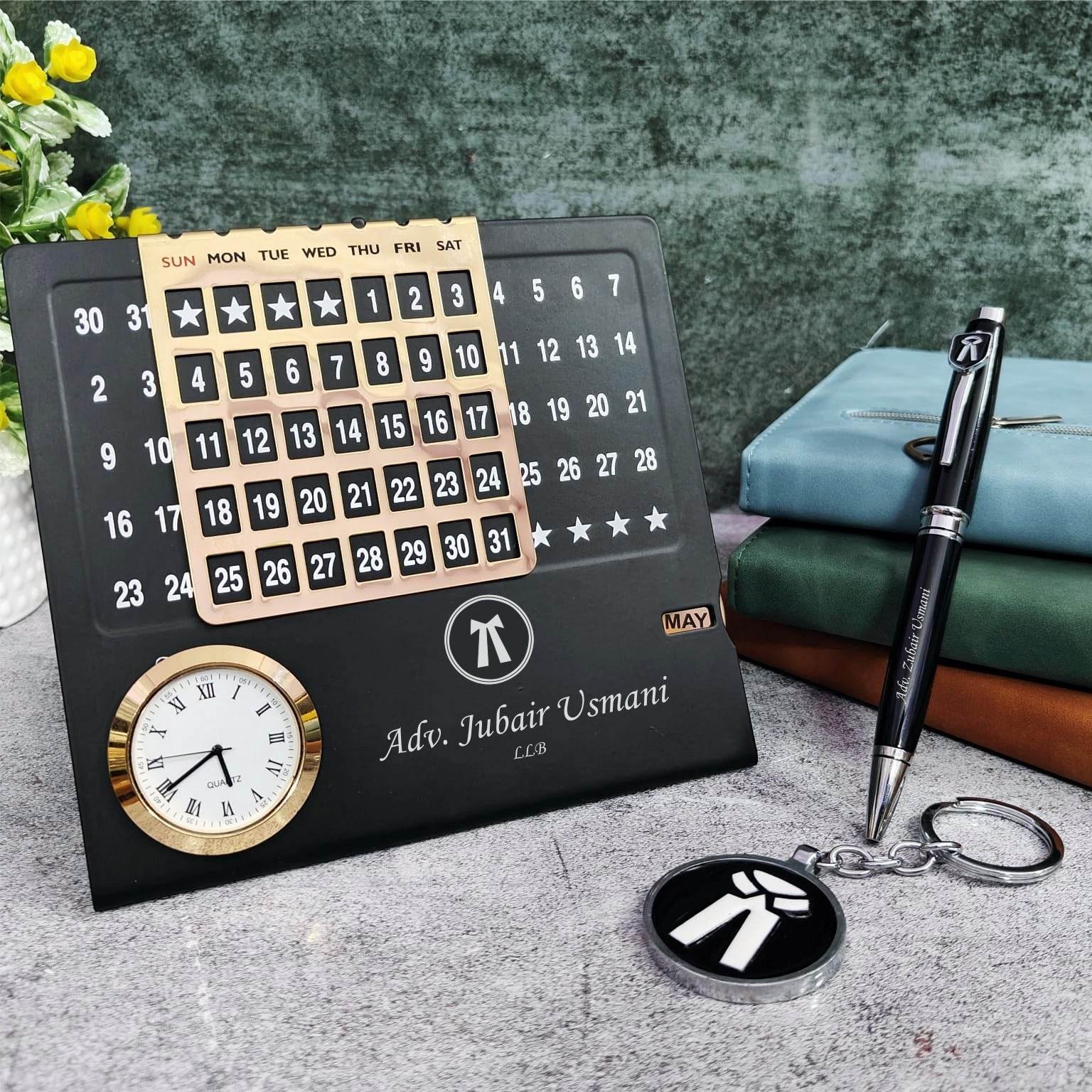 The combo includes a metal infinite calendar tabletop with a clock, a metal pen, and a metal keychain.