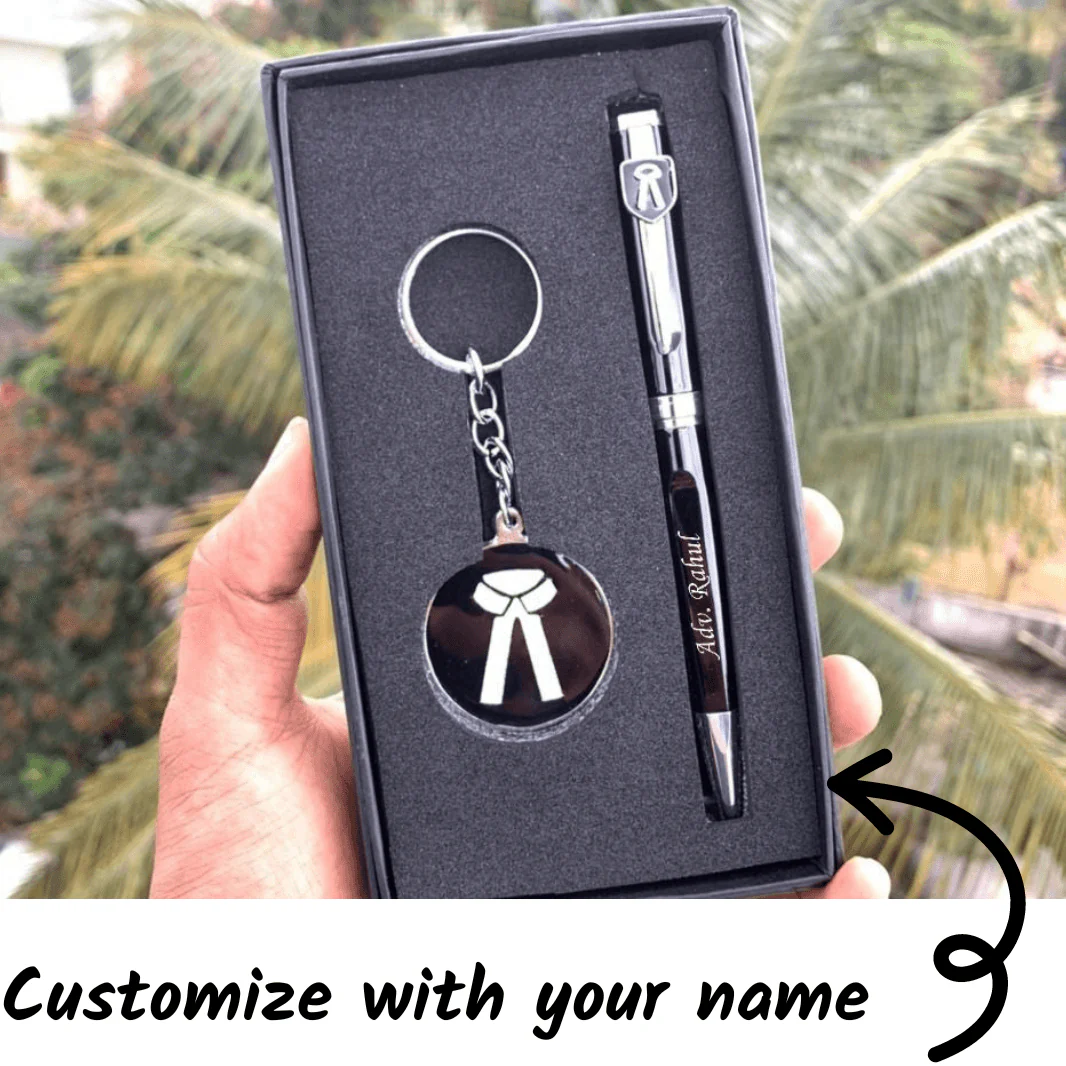 This product is customized especially for Advocates. It includes a pen and keychain. Name on keychain comes on backside.