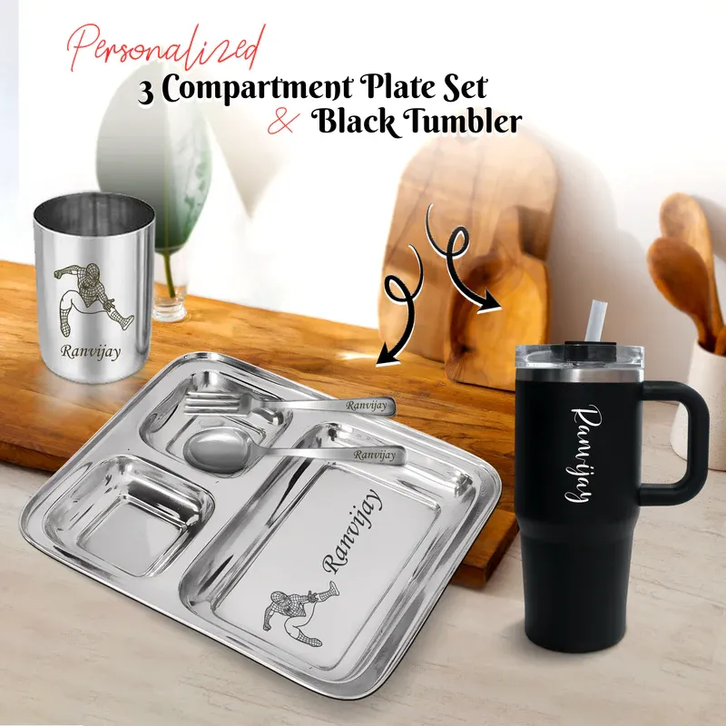 Kids Combo Set – Customized 3-Compartment Steel Plate with Name & Cartoon Design with Name Engraved 500 ml Mini Straw Tumbler