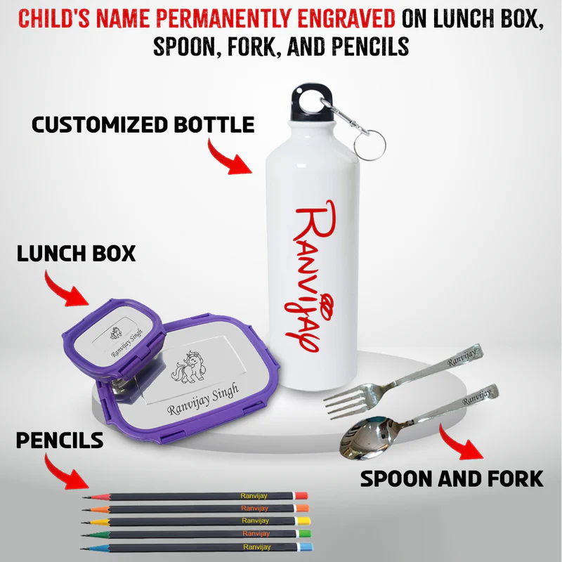 Personalized Kids School Kit – Engraved Lunch Box, Spoon Fork, Bottle & Pencils