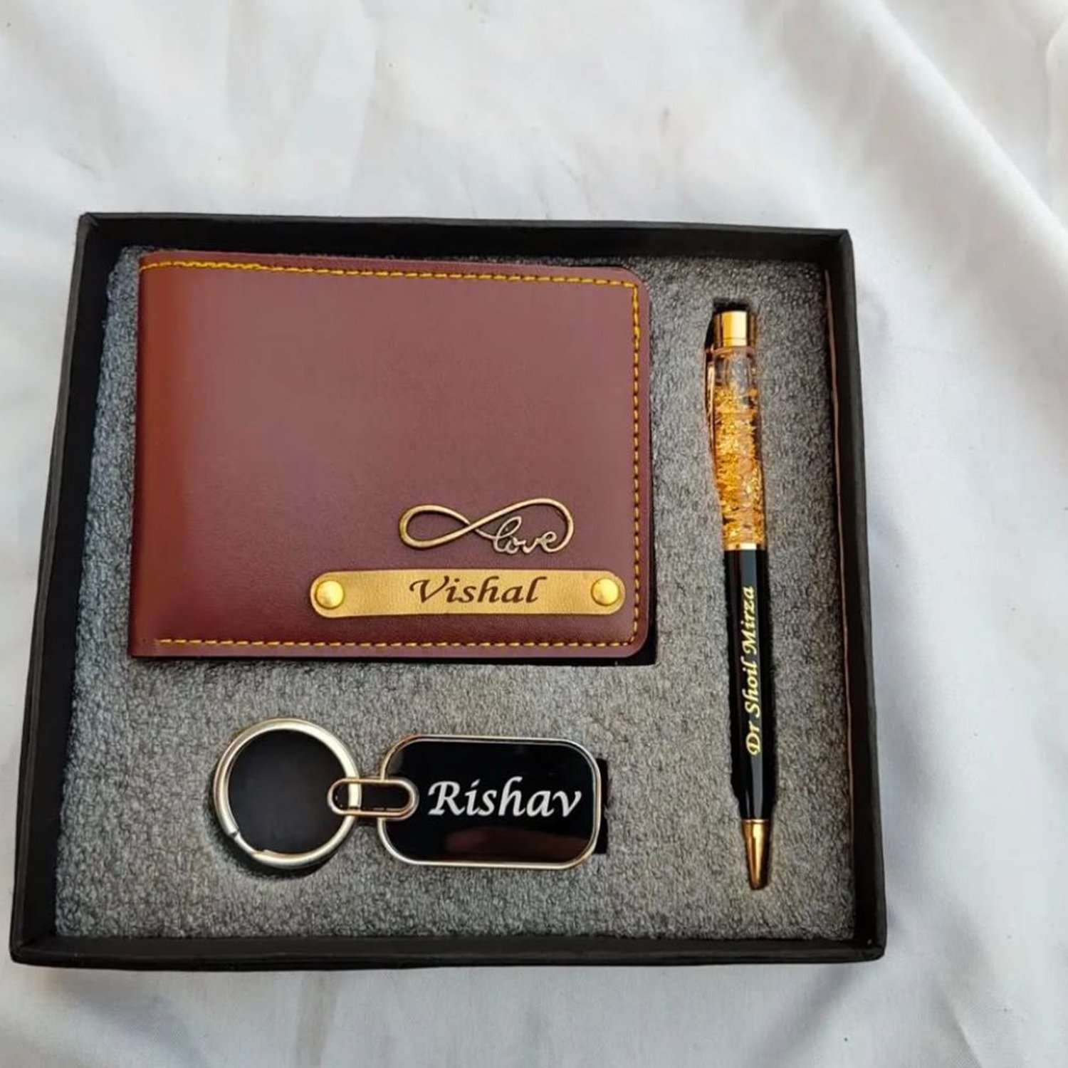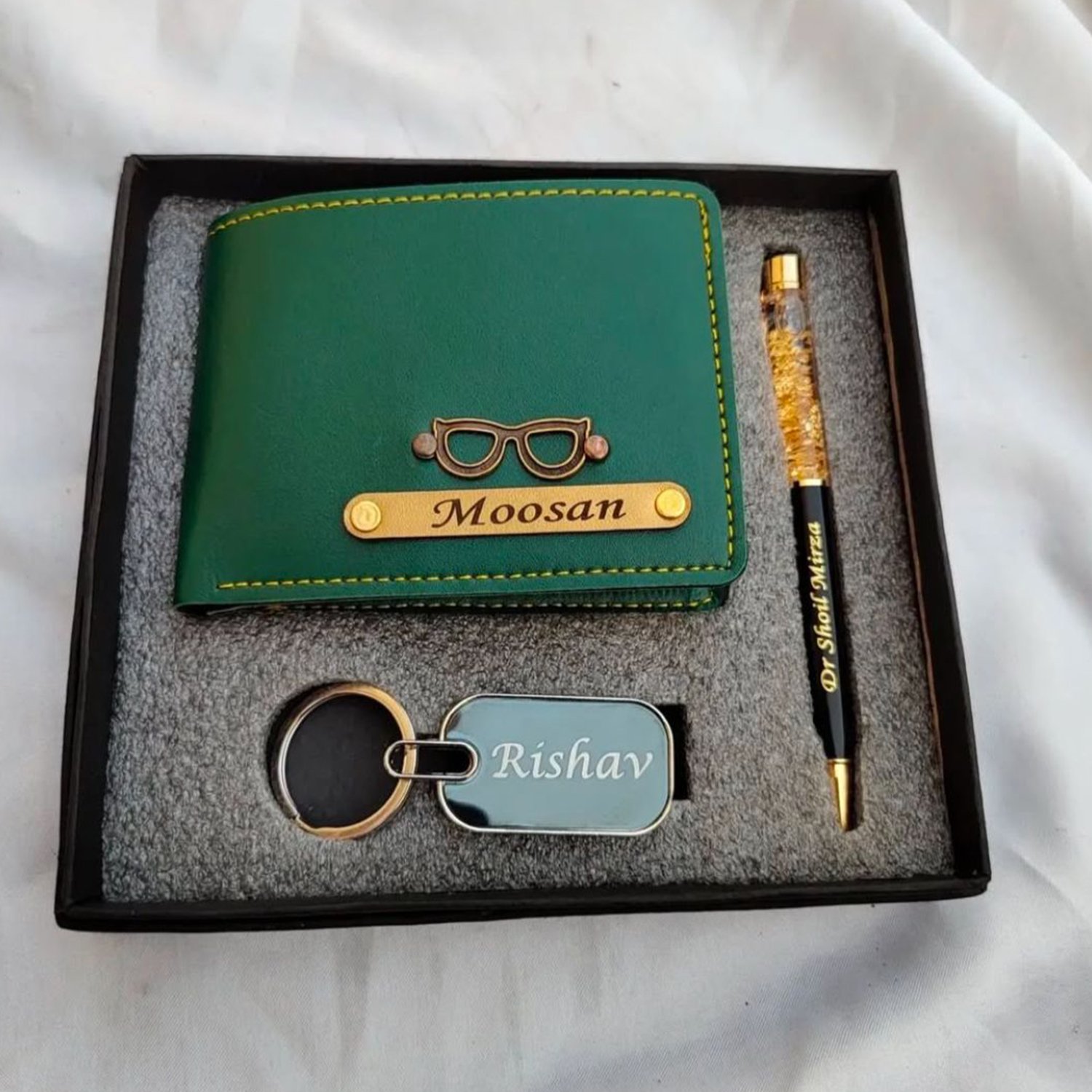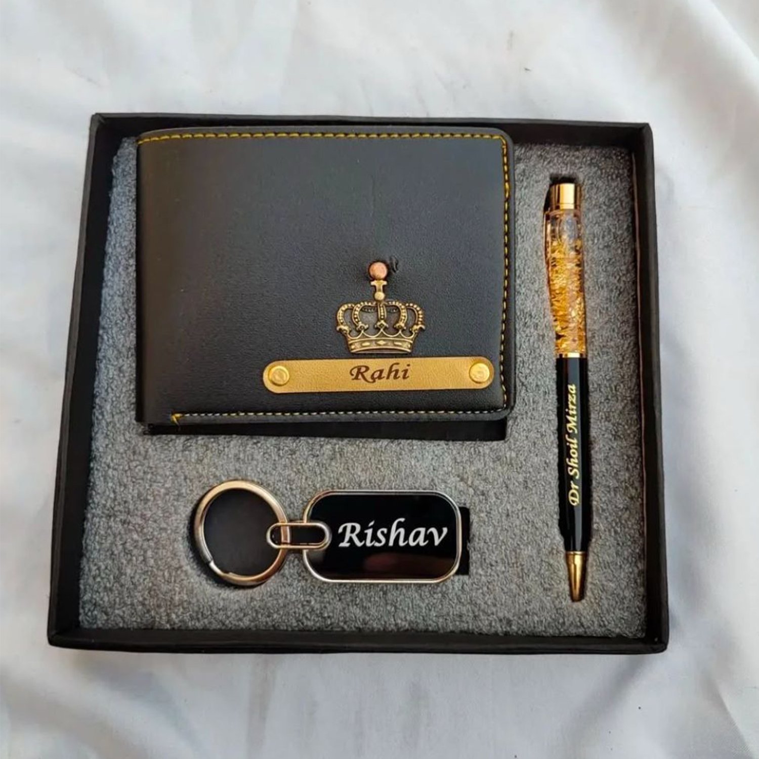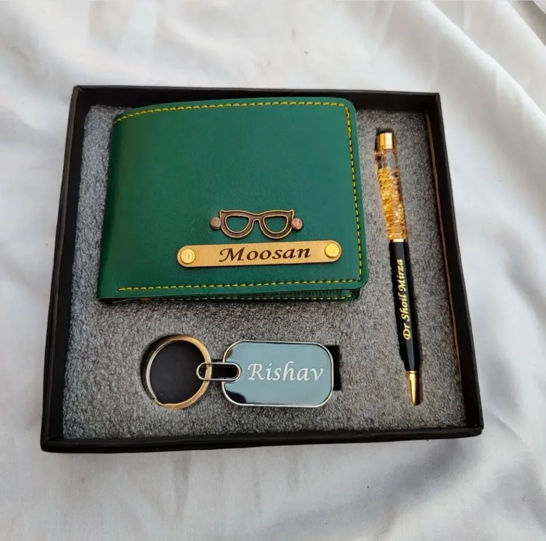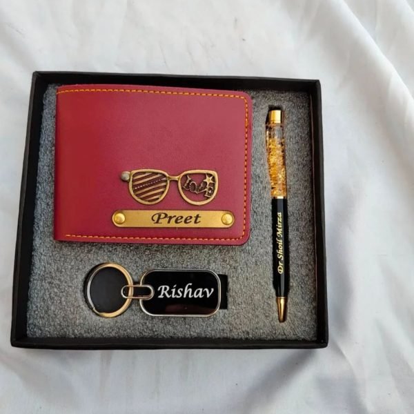 Whether you’re treating yourself or surprising a loved one, the Personalized Wallet, Gold Flake Pen & Keychain Combo is the ultimate gift set that combines style, utility, and personalization.